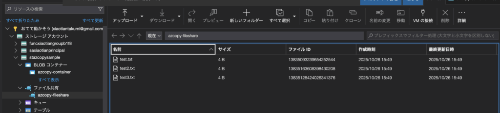 ストレージアカウントを準備して、ファイルとBlobコンテナーを用意しました。