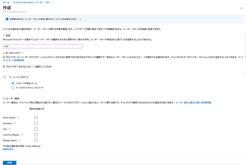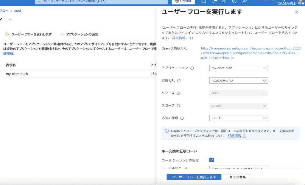 作成後、そのまま[ユーザフローを実行します]を選択してやっていく。