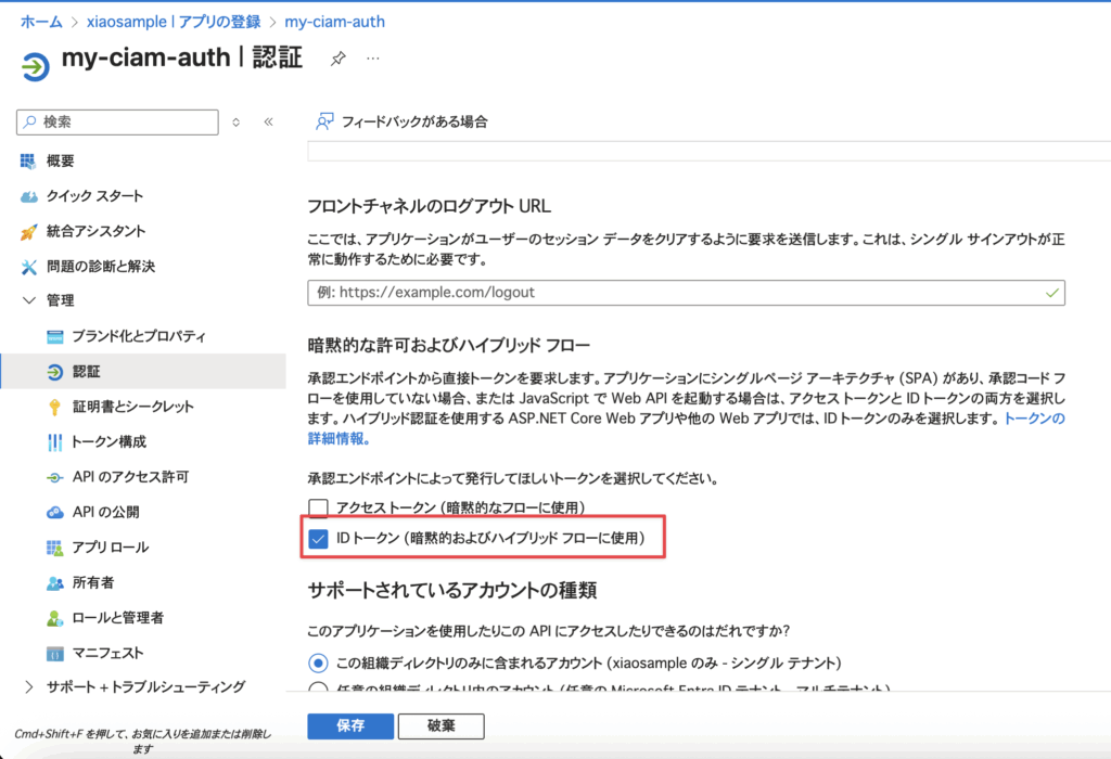 jws.msで表示させるためにIDトークンにチェックを入れる。