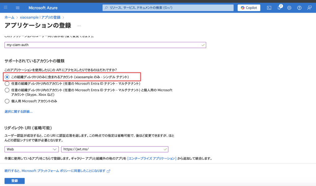 リダイレクトURIはjwt.msにしておく。(今回はidトークン見れるところまでいけたらいいかなという感じ。)