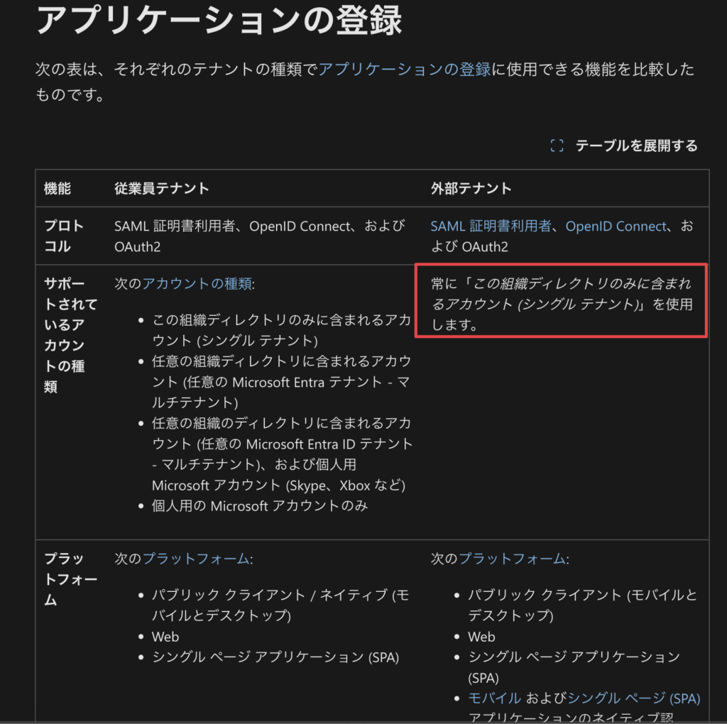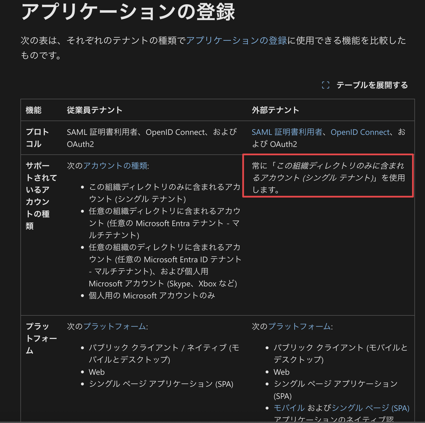 外部テナントで使用する場合は、この組織ディレクトリのみに含まれるアカウントを選ぶ必要がある。これについては下記のドキュメントに書いてある。