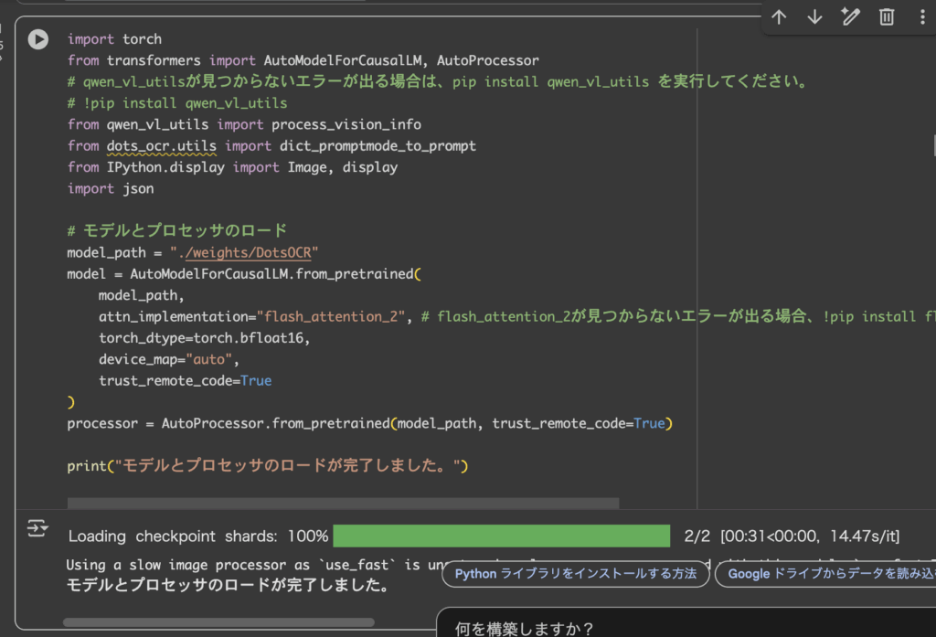 Google Colabでのdots.ocr実行してみようとしたけどうまくいかなかった。