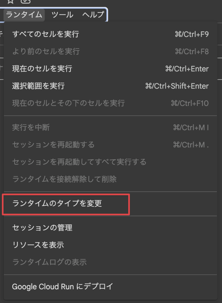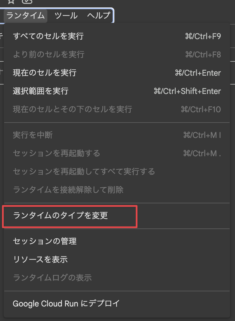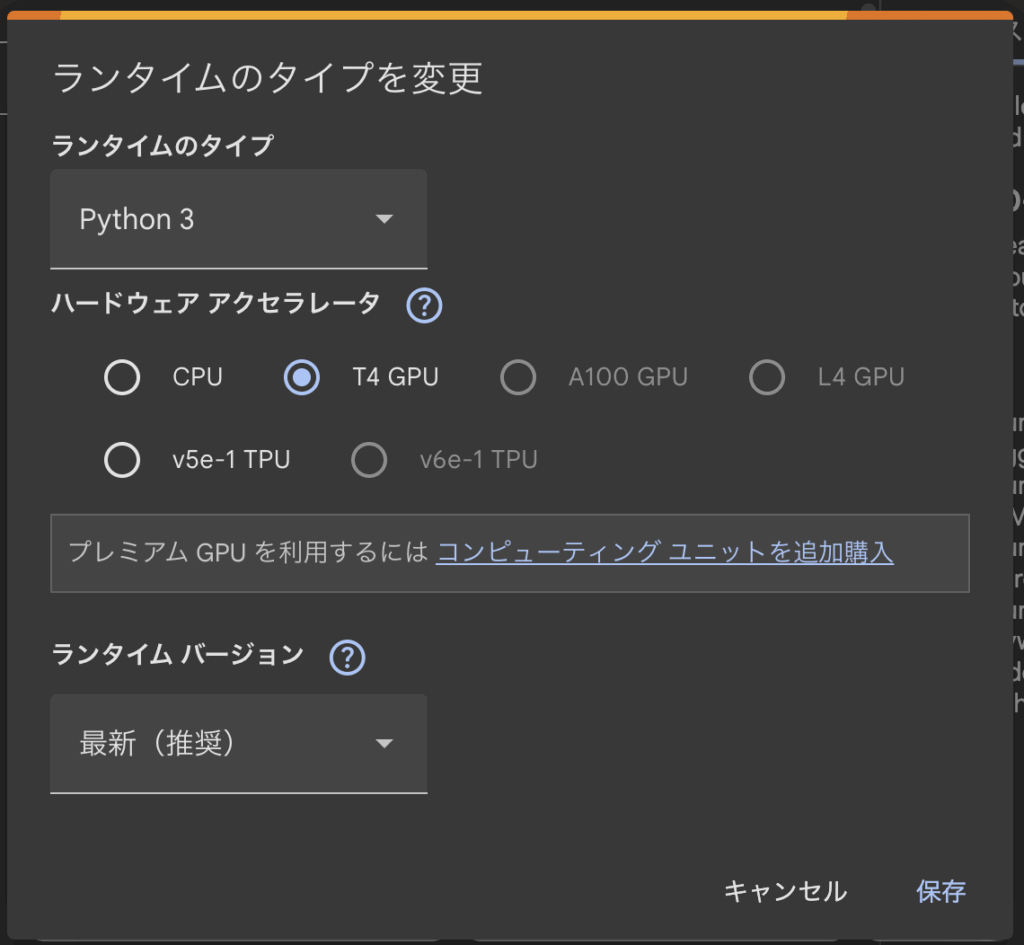 1. メニューの「ランタイム」>「ランタイムのタイプを変更」を選択し、「ハードウェア アクセラレータ」でGPUを選択して保存します。