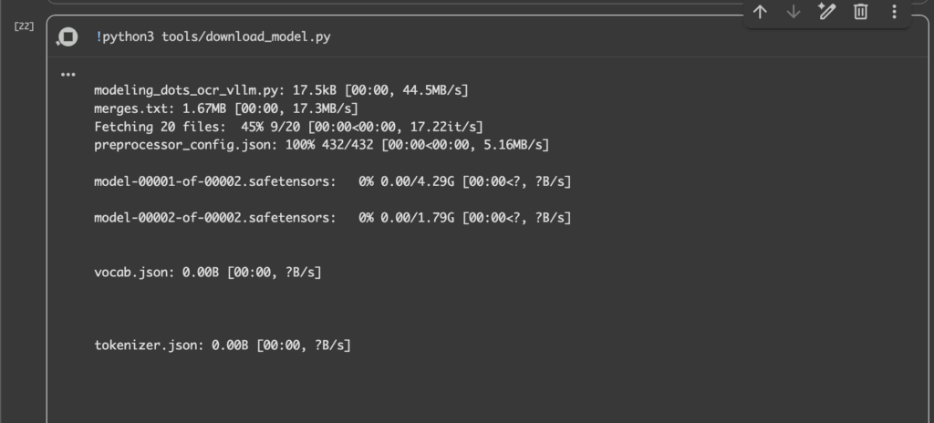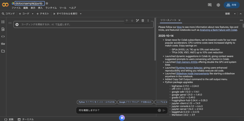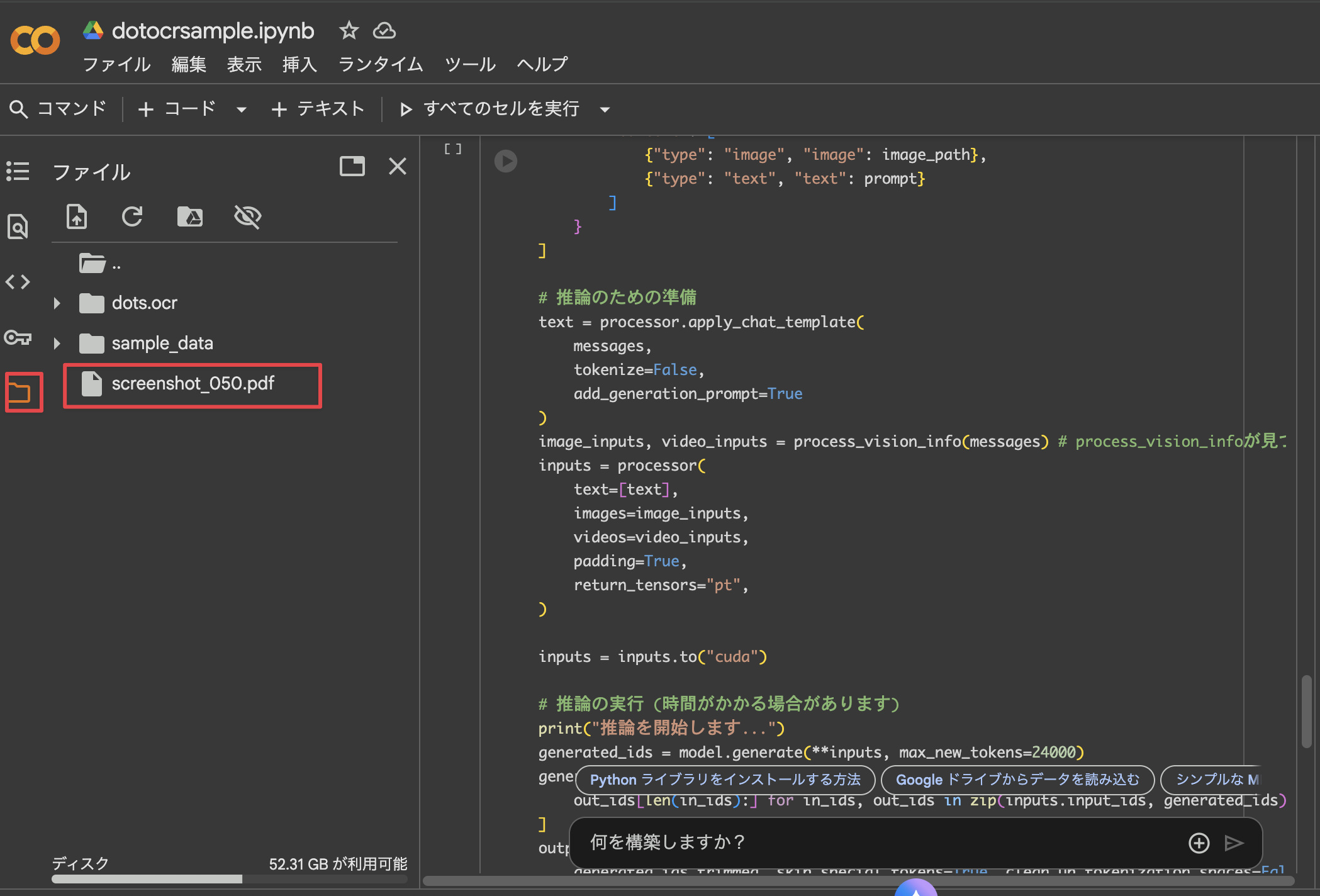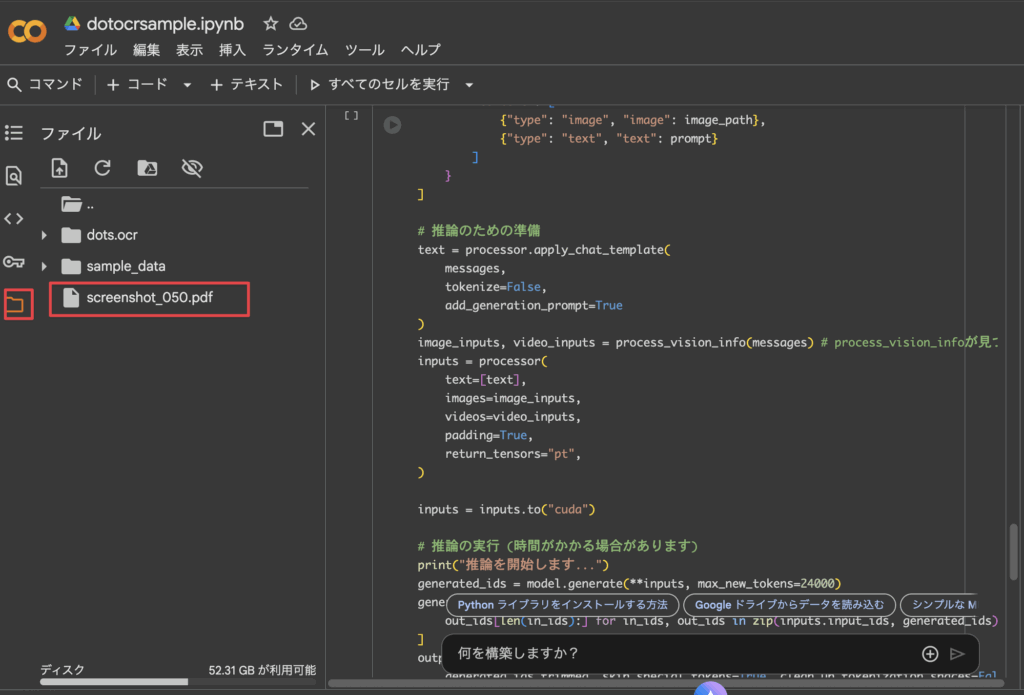 ただし、再起動すると、ノートブックで定義した変数などの「ランタイムの状態」は失われます。ノートブックの最初のセルから順番に再度実行してください。特に、%cd dots.ocr でディレクトリを移動するセルは必ず再実行が必要です。