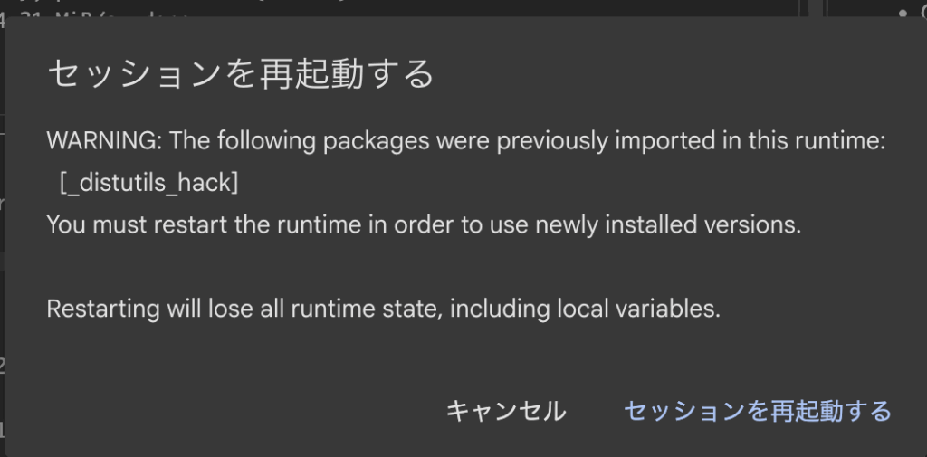 Google Colabでは、いくつかのパッケージ(特にsetuptoolsなど、他のパッケージのインストール方法に影響を与えるもの)をアップデートした場合、その変更を確実に反映させるためにランタイム(セッション)の再起動が必要になることがあります。